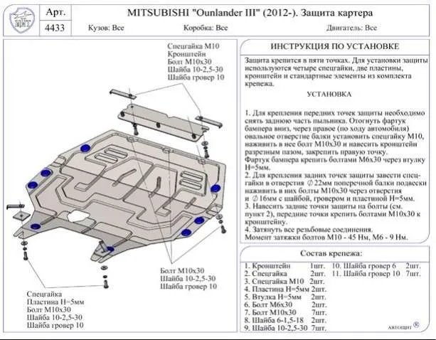 Металлическая защита двигателя и кпп Mitsubishi Outlander 3 2012-. Оригинальный номер 4433