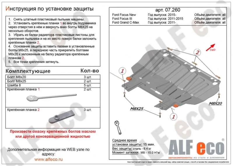 Металлическая защита двигателя и кпп Ford Focus 2 2004-2010. Оригинальный номер ALF07260