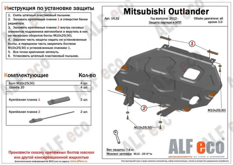 Металлическая защита двигателя и кпп Mitsubishi Outlander 3 2012-2022. Оригинальный номер ALF1431
