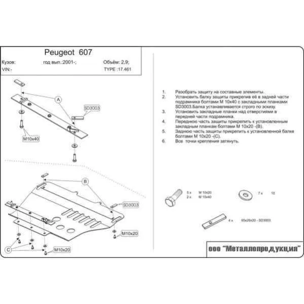 Металлическая защита двигателя и кпп Peugeot 607 2000-2010. Оригинальный номер 17.0461