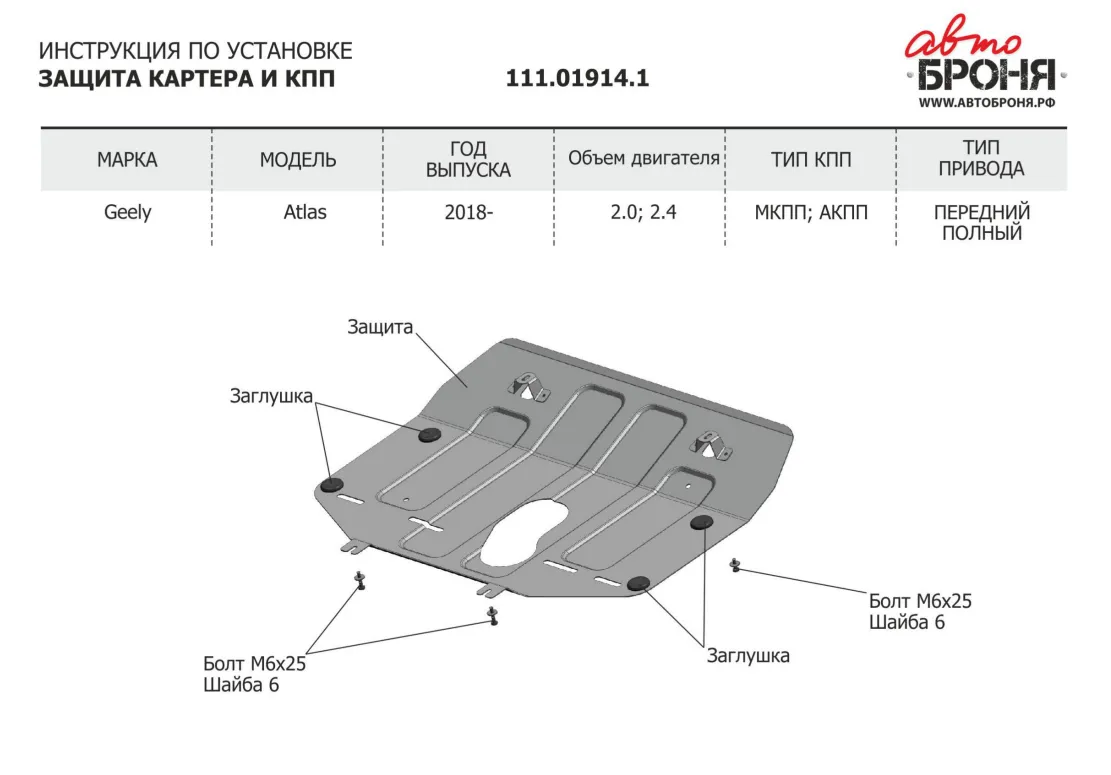 Металлическая защита двигателя и кпп Geely Atlas 2016-2022. Оригинальный номер 111019141