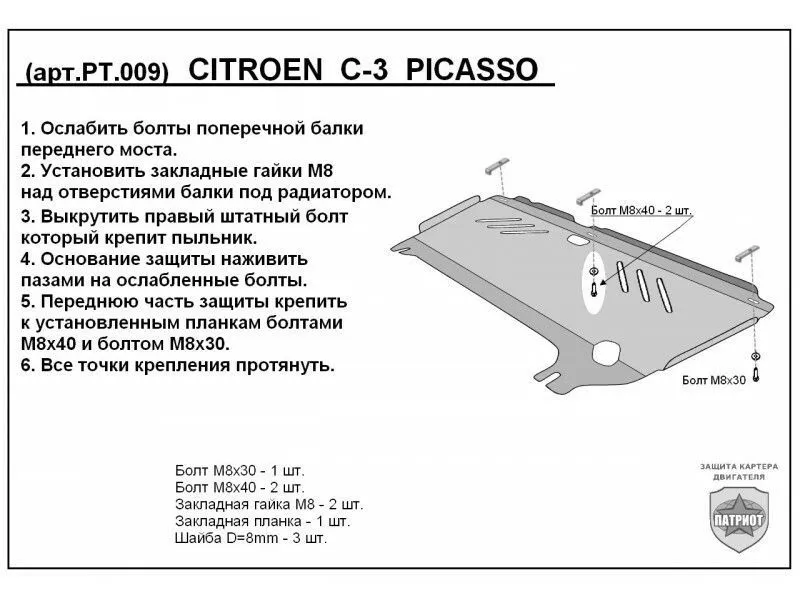 Сталь 2мм, обработана полимерной краской, крепеж в комплекте, установка в штатные места