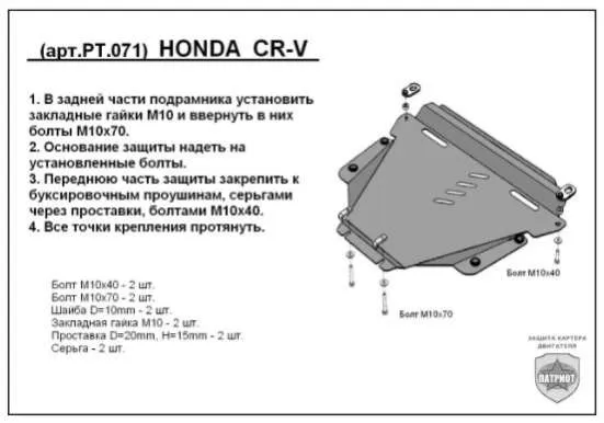 Металлическая защита двигателя и кпп Honda CR-V 3 2006-2012. Оригинальный номер PT.071