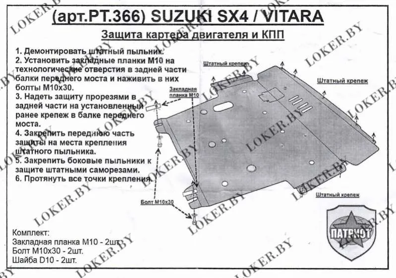 Сталь 2мм, обработана полимерной краской, крепеж в комплекте, установка в штатные места