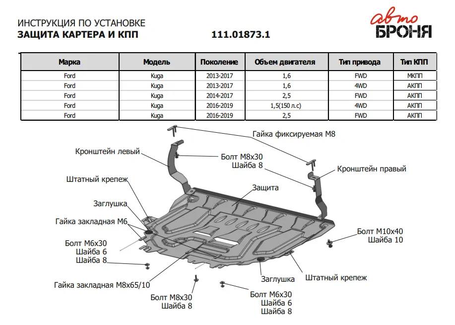Металлическая защита двигателя и кпп Ford Escape 2012-2020. Оригинальный номер 111.01873.1