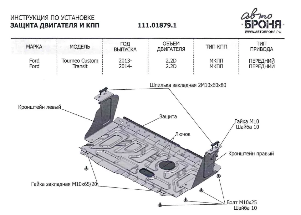 Металлическая защита двигателя и кпп Ford Tourneo Custom 2012- 2017. Оригинальный номер 111.01879.1