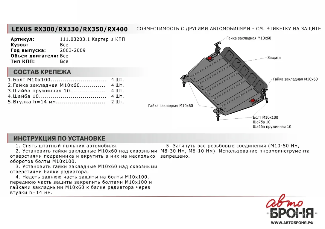 Металлическая защита двигателя и кпп Lexus RX 2 2003-2008. Оригинальный номер 111.03203.1