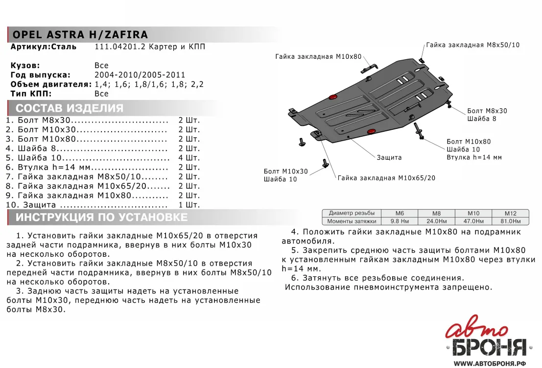 Металлическая защита двигателя и кпп Opel Astra H 2004-2014. Оригинальный номер 111.04201.2