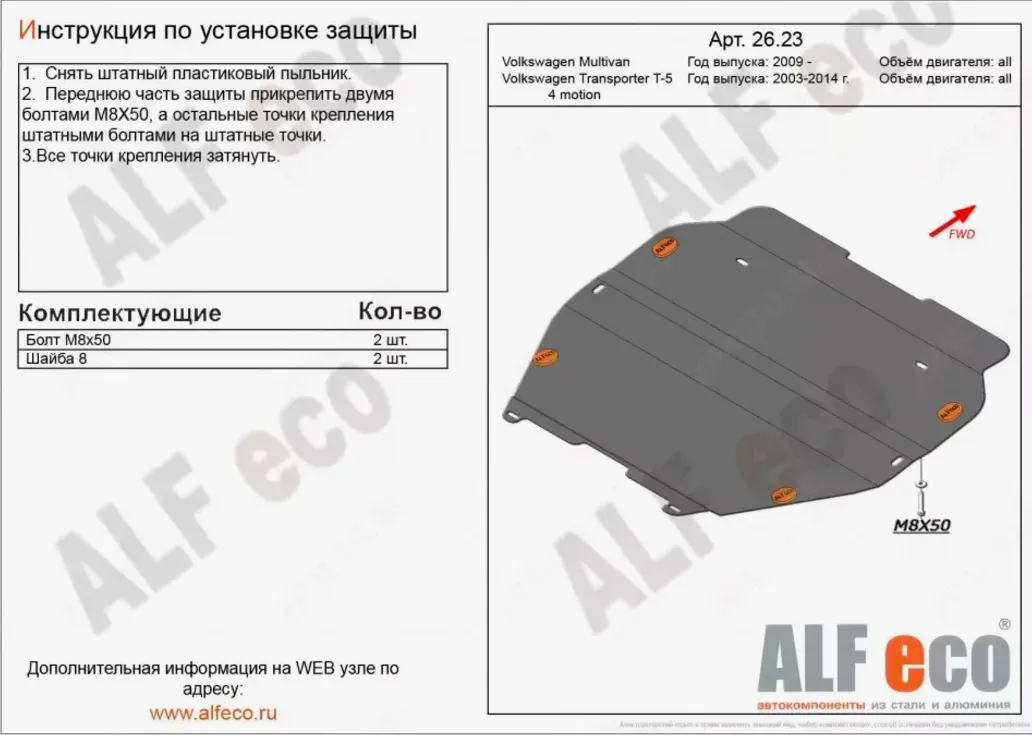 Металлическая защита двигателя и кпп Volkswagen T5 2003-2015. Оригинальный номер ALF2623,ALF2634