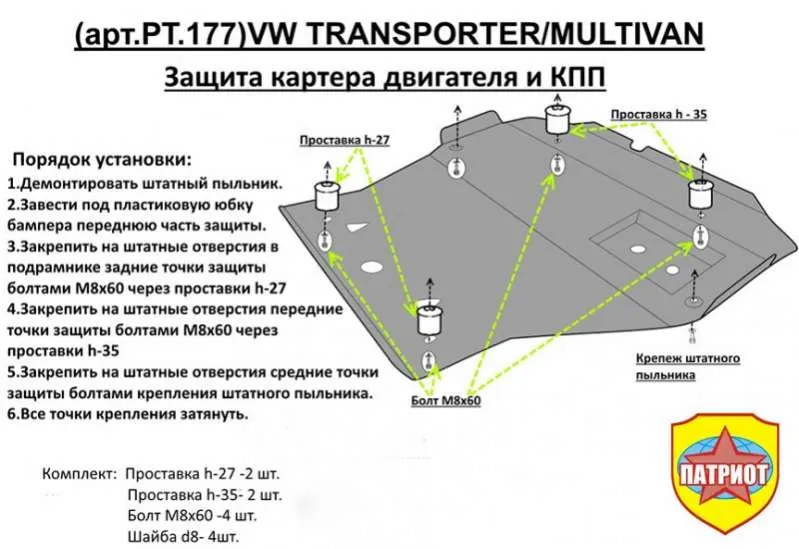 Металлическая защита двигателя и кпп Volkswagen T5 2003-2015. Оригинальный номер PT.177